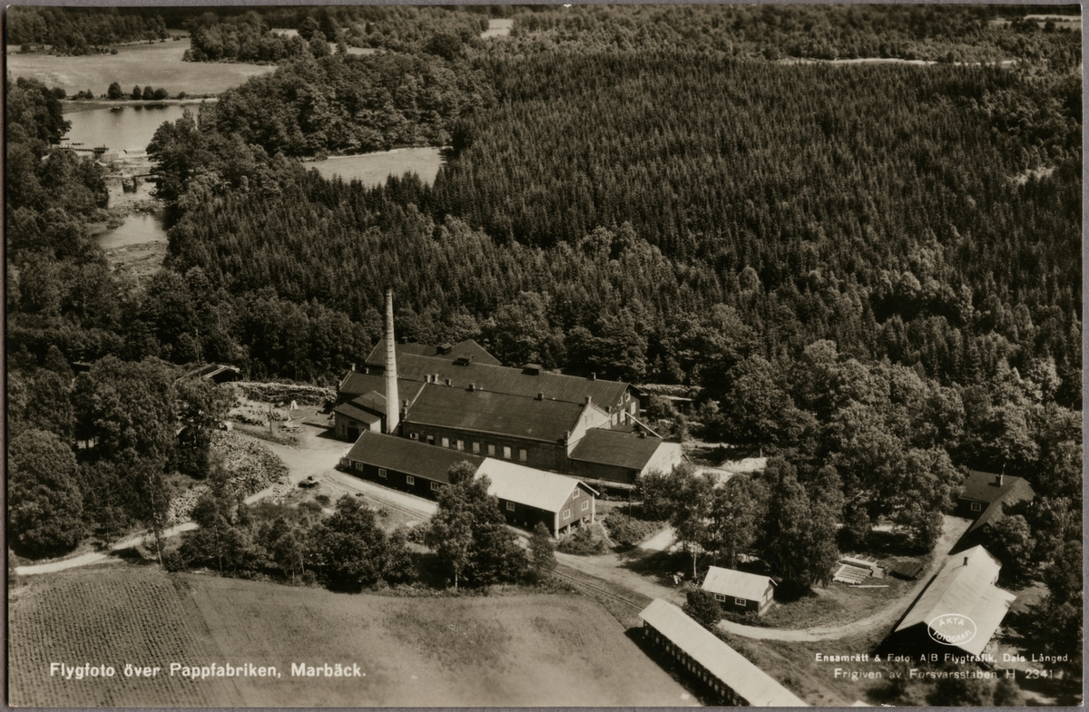 Bild från flygplan över pappfabriken i Marbäck med omnejd.