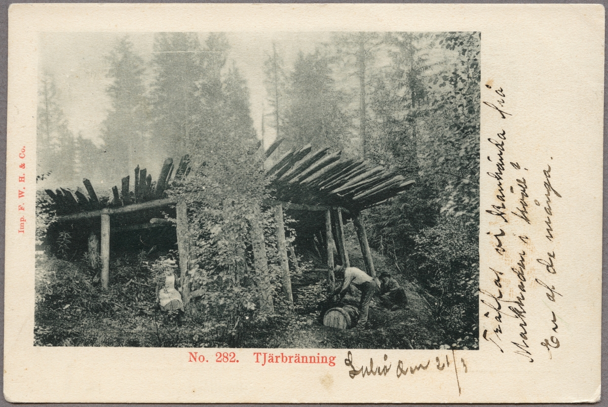Titel: Tjärbränning i Norrland omkring förra sekelskiftet.