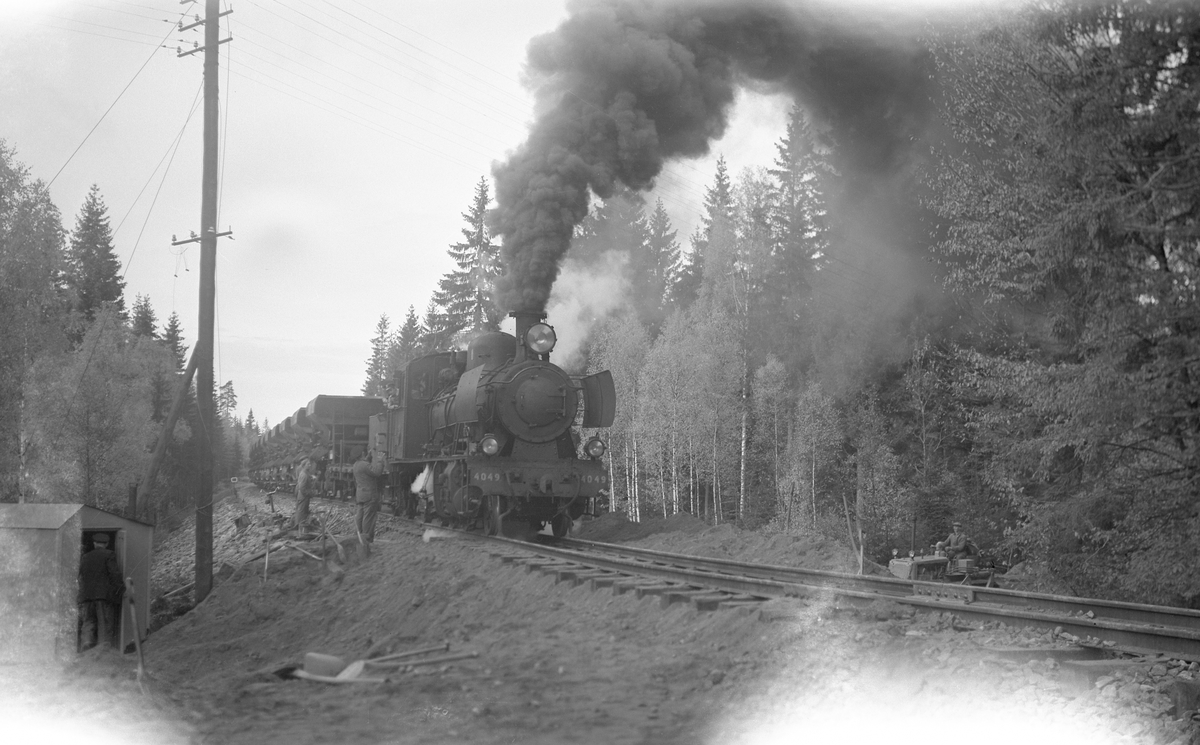 Statens Järnvägar, SJ Gt 4049 med tåg vid breddningen av linjen Ronneby - Johannishus.