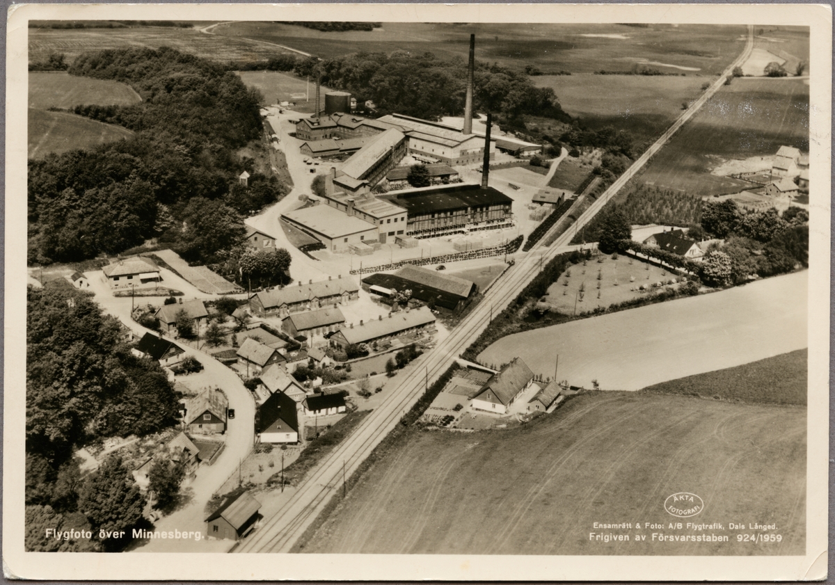Översiktsbild taget från flygplan över Minnesberg, fabriken i bild är Minnesbergs tegelbruk. Till höger om bruket går Lund-Trelleborgs Järnväg, LTJ.