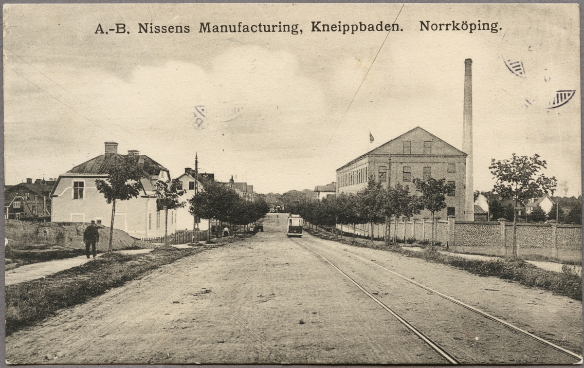 Spårvagn på grusgata passerar Nissens chokladfabrik i stadsdelen Kneippen, Norrköping.