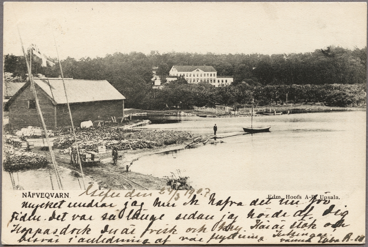 Vy över hamnen i Nävekvarn med herrgården i bakgrunden. Unionsflaggan är hissad. Arbetare vid en vagn på järnvägsspåret som leder till bruket.