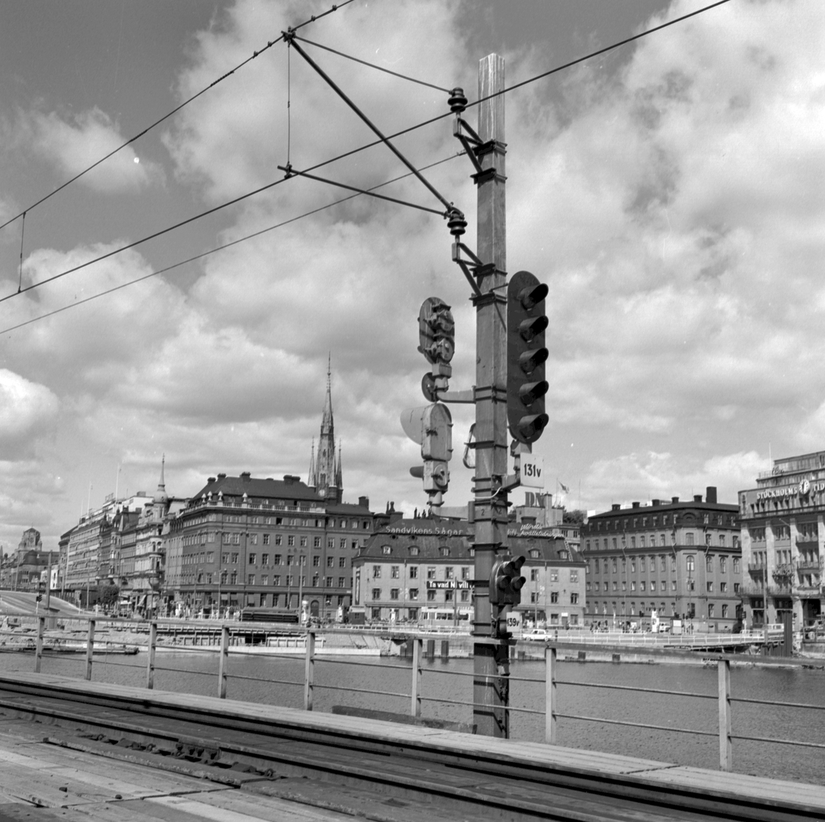 Signaler på Riddarholmsbron, mellan Stockholm Central och Riddarholmen. Klara Kyrka i bakgrunden.