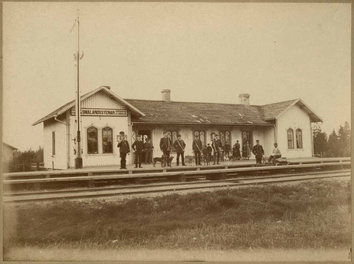 Smålands stenar station med jaktsällskap. Personerna på bilden är troligen ett jaktlag från Isberga. Huset brann ner till grunden 1903.