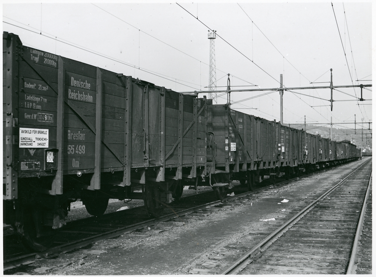 Tyskt militärtåg på väg mot Norge under andra världskriget. Här på Östersunds centralstation.