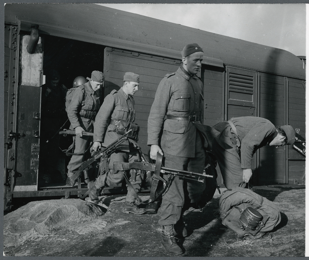 Titel: Militärtransport på linjen mellan Nässjö - Falköping. Ombyggd godsvagn för husering av soldater.