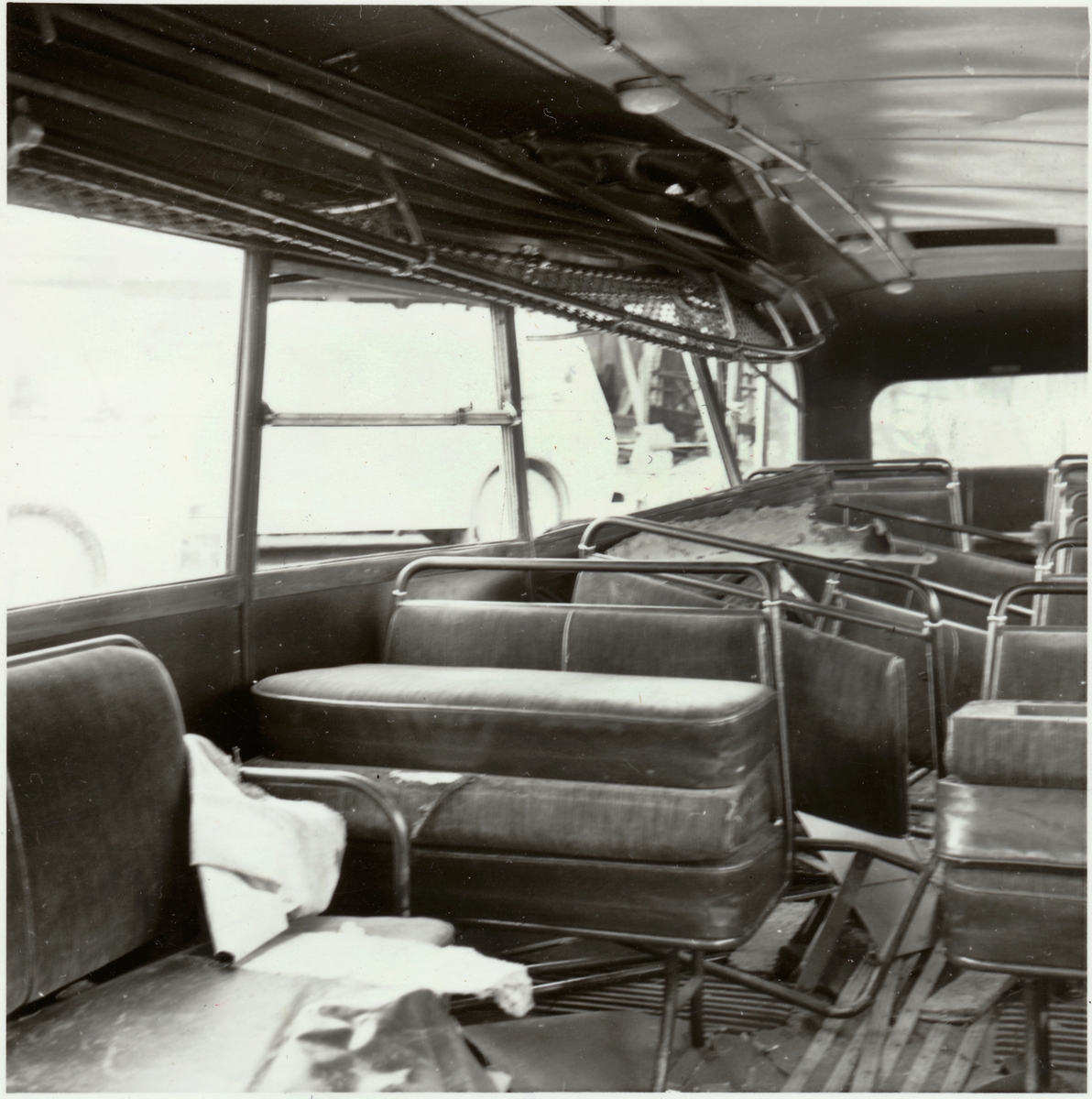 Statens Järnvägar, SJ Buss 689-C invändigt efter kollision med tåg.
