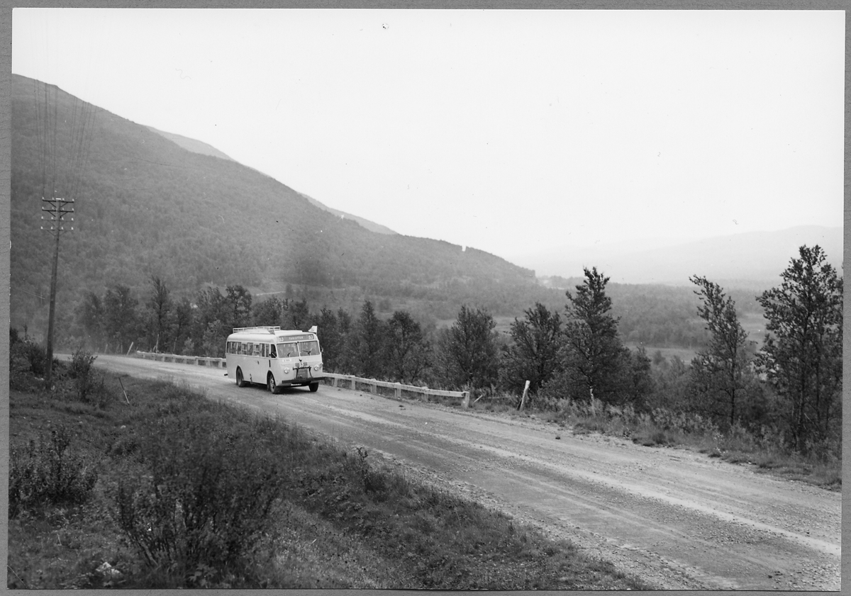 Statens Järnvägar, SJ turistbuss på landsväg vid Bruksvallarna, Härjedalen.
