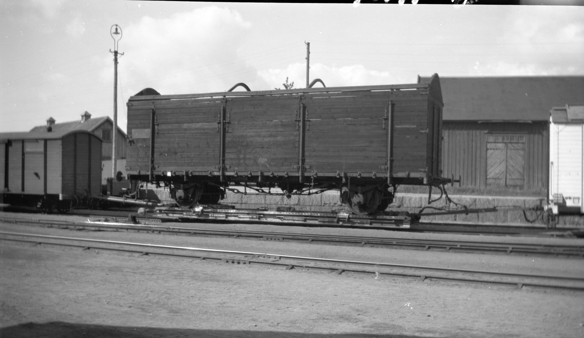 Stångkoppel. Smalspårig överföringsvagn, Statens Järnvägar, SJ Q37p 300015 lastad med en normalspårig godsvagn, SJ Or 39358.