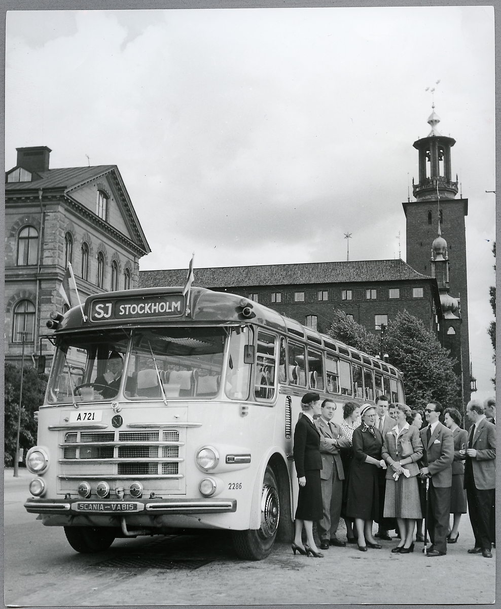 Scania-Vabis B63 turistbuss vid stadshuset. Statens Järnvägar, SJ buss 2286.