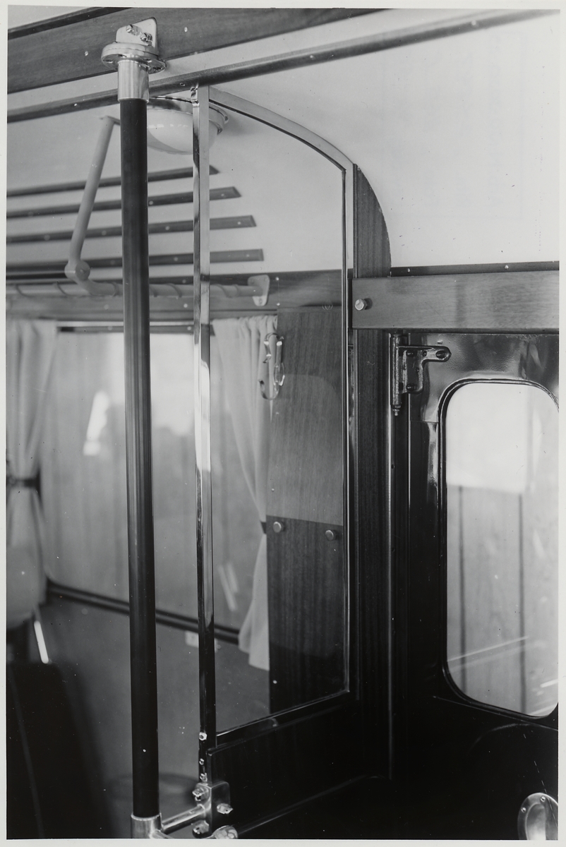 Titel: Inredning i en buss. Dörr vid utgång.