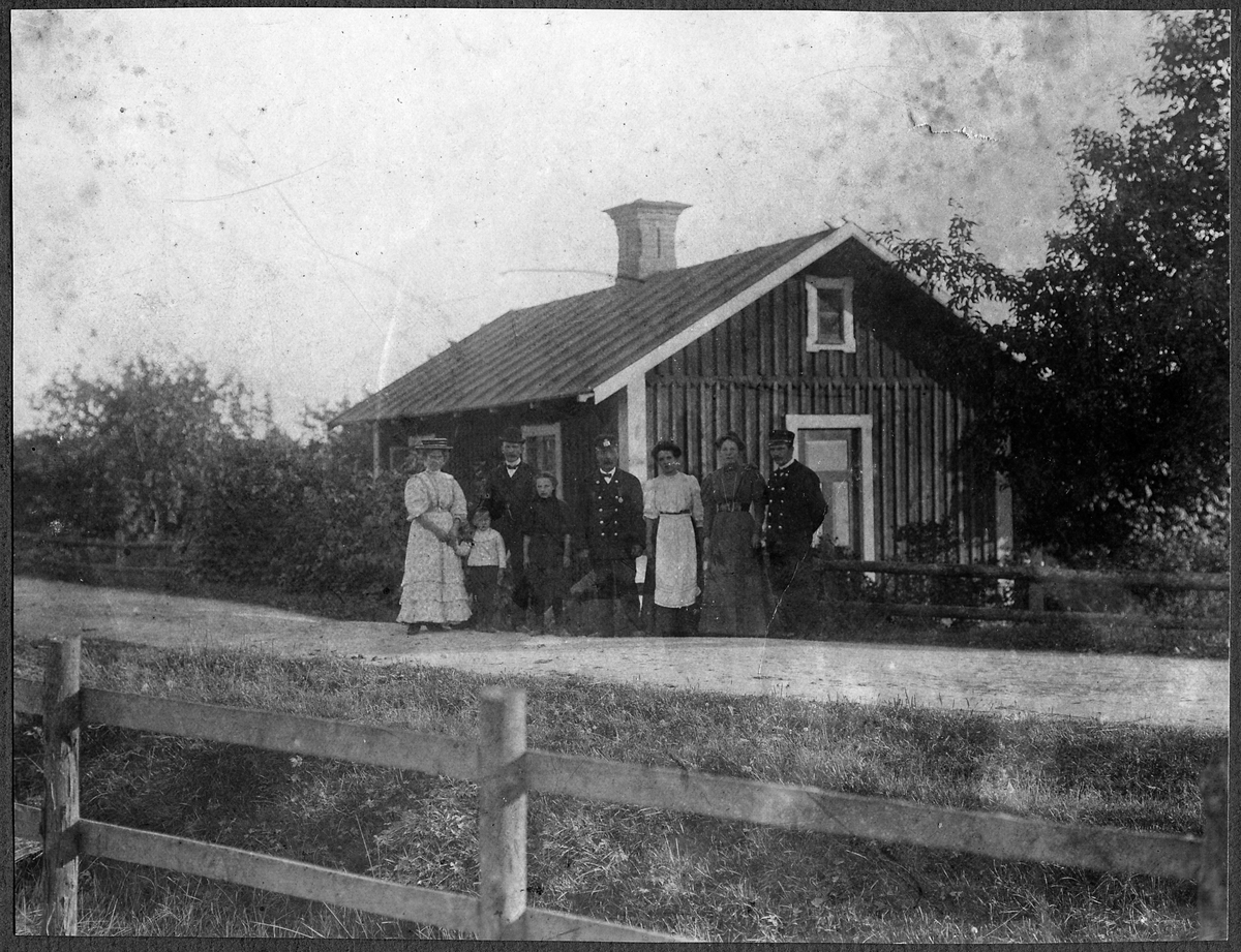 "Banvakt Pettersson utanför banvaktstugan i Hjortekrog, på sträckan mellan Hjortekrog och Mommehål.