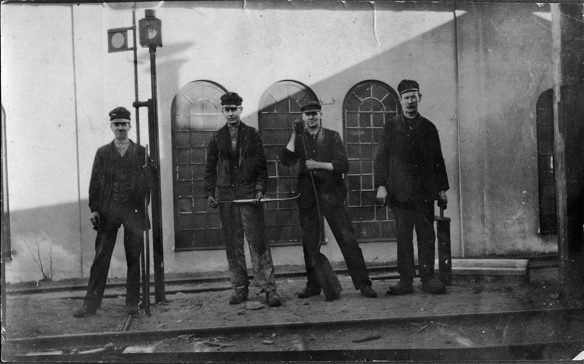 Lokstallspersonal utanför verkstaden i Västervik. Från vänster: Gösta Skepp, Karl Gustavsson, A. Andersson samt lokförare Ljungberg.