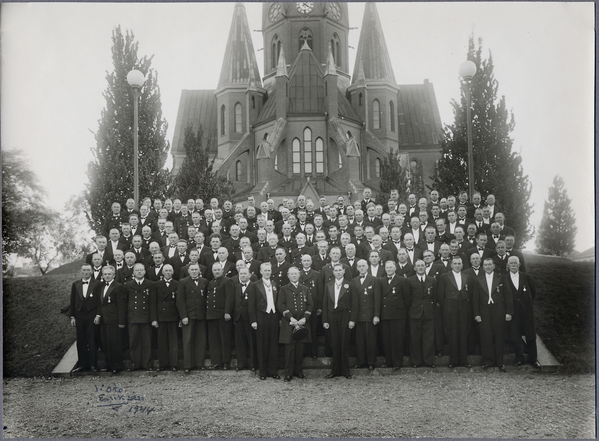 1944 års medaljörer vid Norsholm - Västervik - Hultsfreds järnvägar, för lång och trogen tjänst. Här framför S:t Petri kyrka i Västervik.