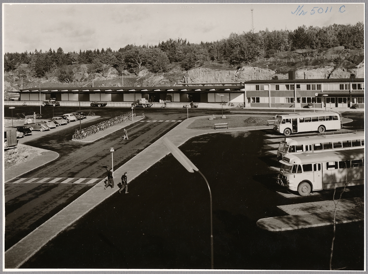 Karlshamns station med godsmagasin, från gatusidan. Statens Järnvägar buss 2462.