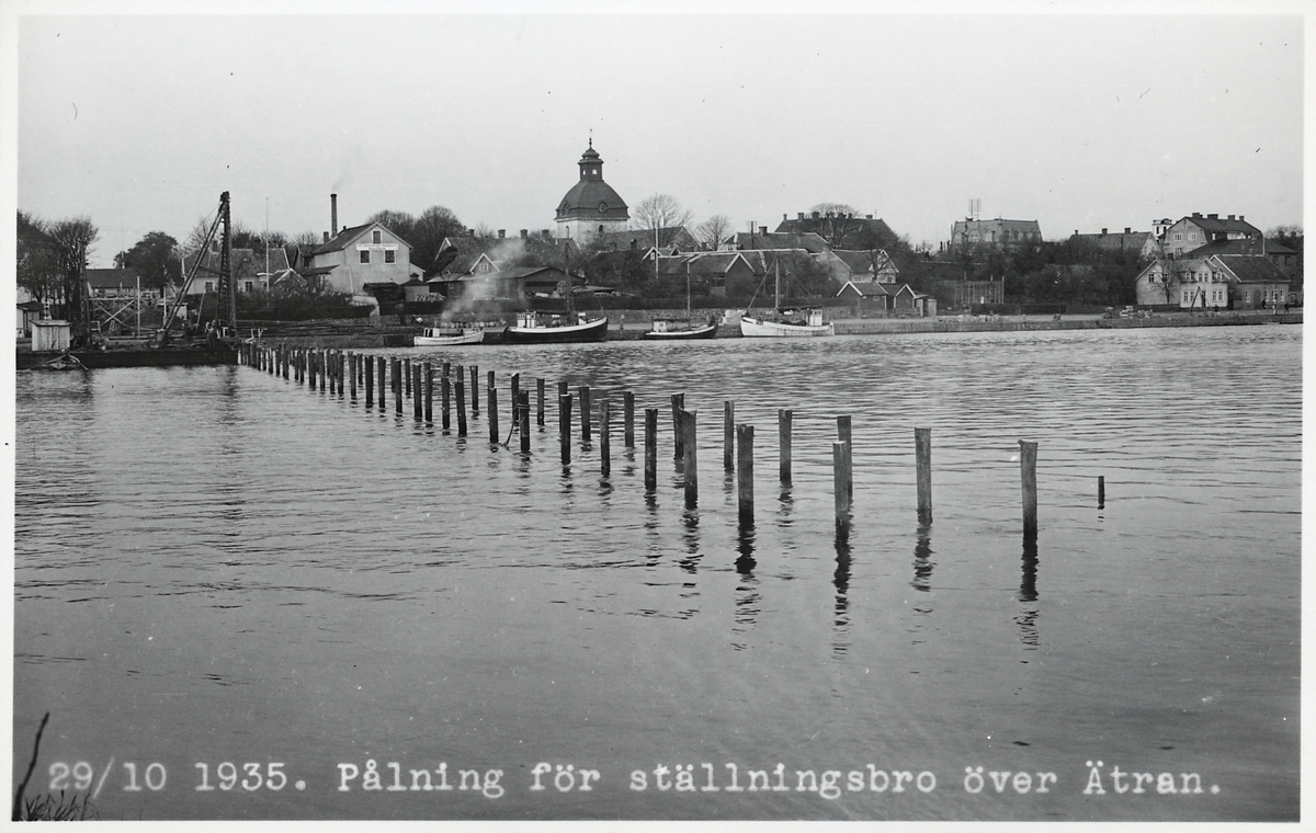 Pålning för ställningsbro inför byggandet av ny järnvägsbro över Ätran i Falkenberg.