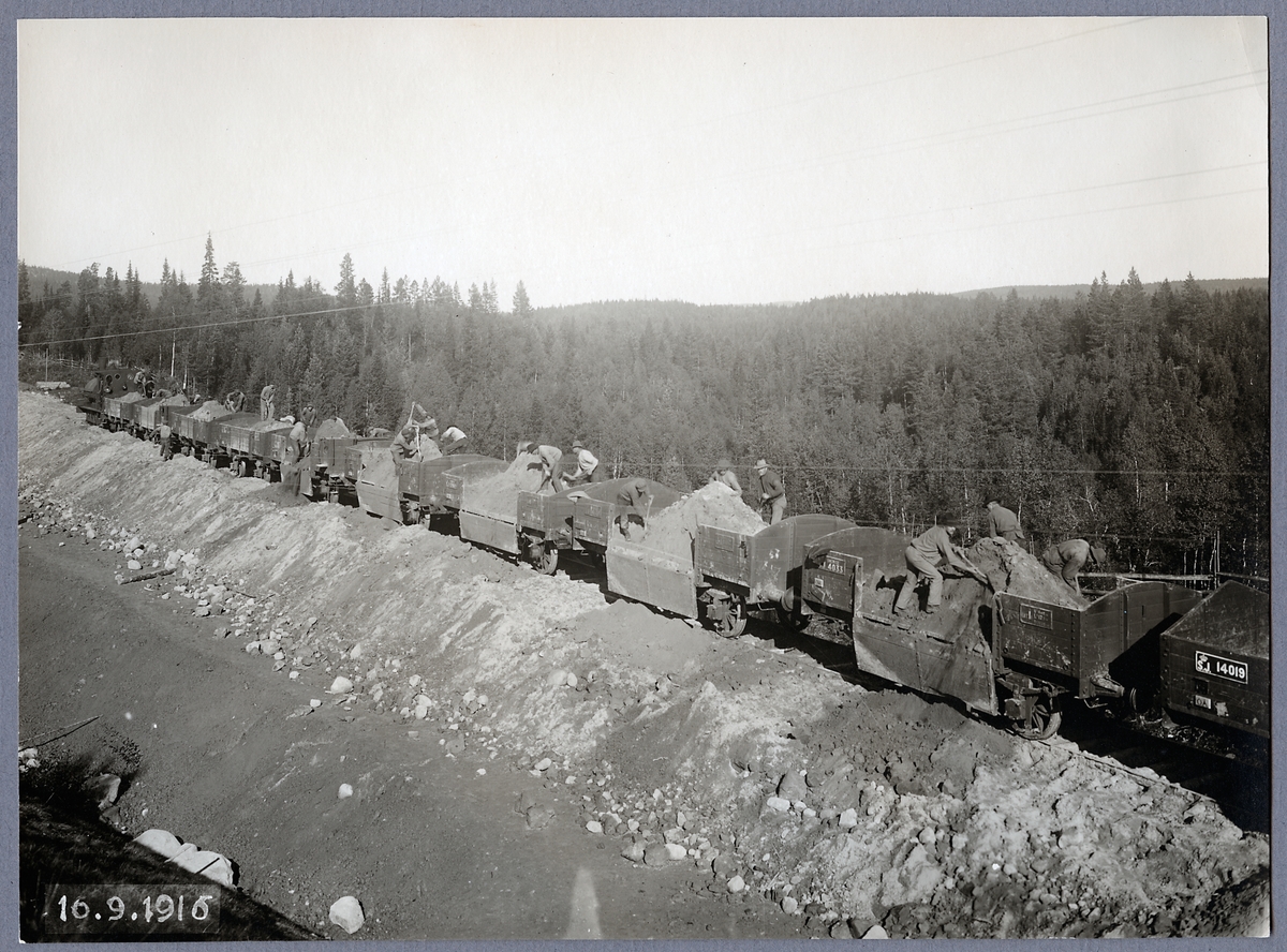 Tippning av sand vid brobygget över Öreälven. De två godsvagnarna närmast till höger är Statens Järnvägar, SJ 14019 och SJ 4033.