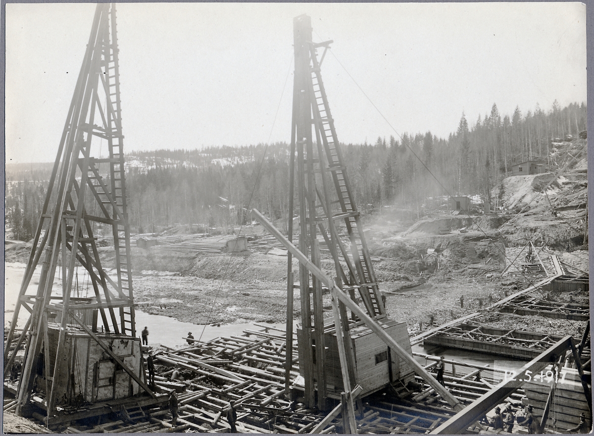 Betongpålning för östra strandpelaren vid brobygget över Öreälven.