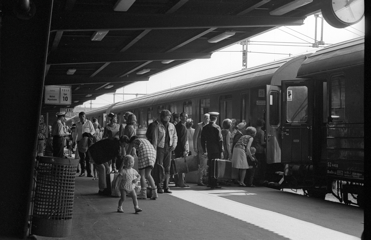 Stockholms Centralstation. Midsommar resenärer stiger ombord på Malmö/Köpenhamnståget.