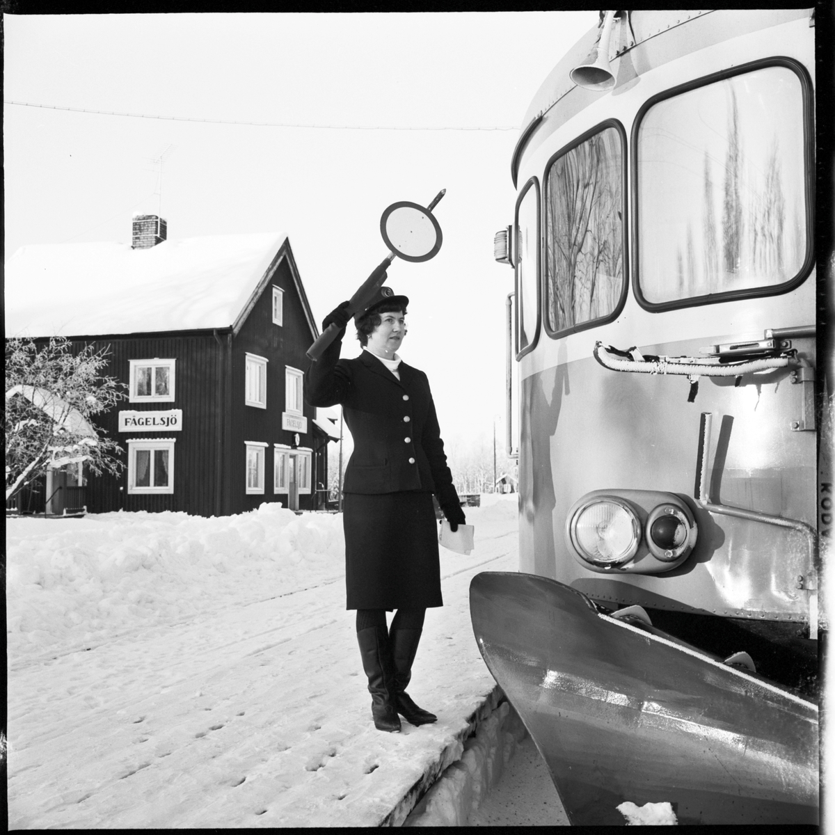Margot Björk ger signal till Statens Järnvägar, SJ YB08 1133 vid Fågelsjö station.
