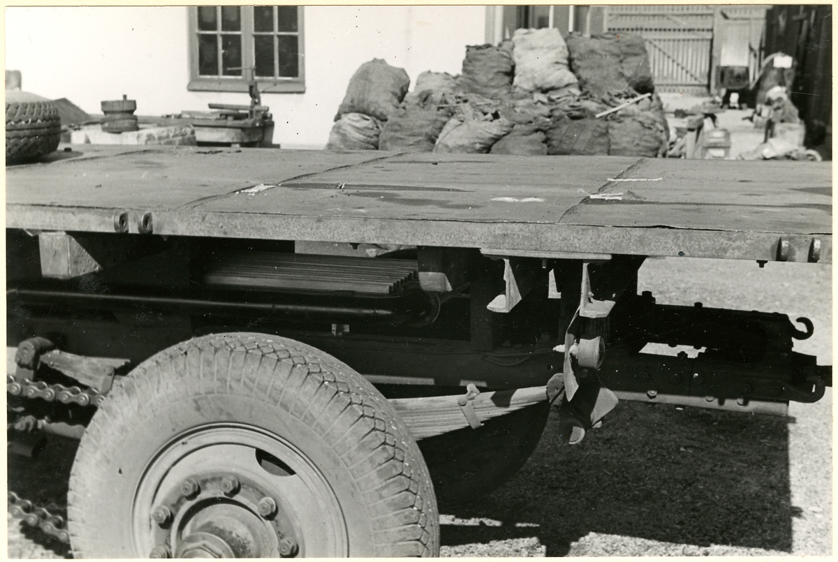 Titel: Flak till en traktor eller lastbil och en hög med säckar i bakgrunden.
