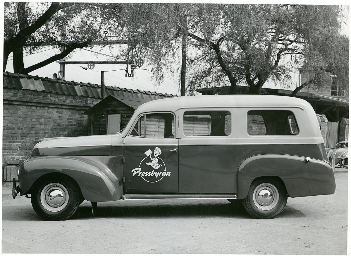 Volvo PV 833 med Pressbyråns logotyp. Reklambild.