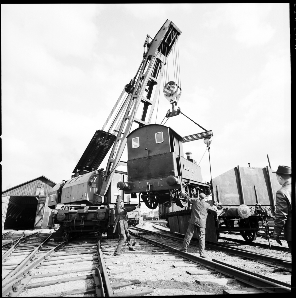 Titel: Loktransport från järnvägsmuseet i Tomteboda. UWHJ 1 "Trollhättan". Ånglyftkran troligen från Hagalund