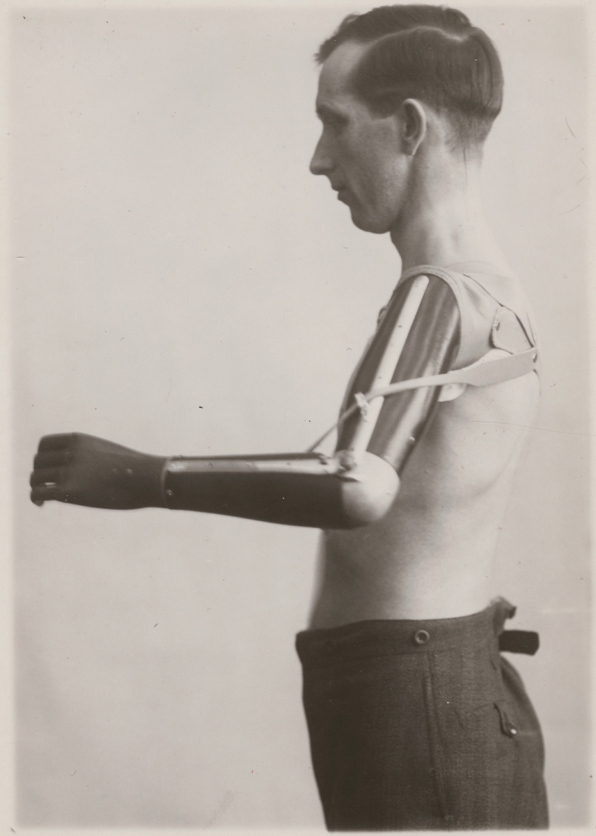 Titel: Fotografi från "Redogörelse för tillverkning vid Statens Järnvägars protesverkstad i Nässjö", 1932. Visar armprotesens rörelseförmåga och användbarhet.