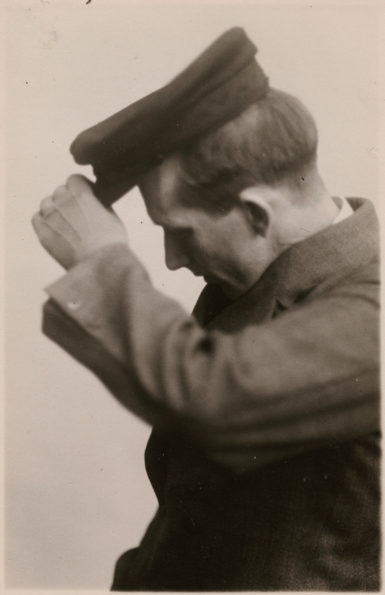 Titel: Fotografi från "Redogörelse för tillverkning vid Statens Järnvägars protesverkstad i Nässjö", 1932. Visar armprotesens rörelseförmåga och användbarhet.