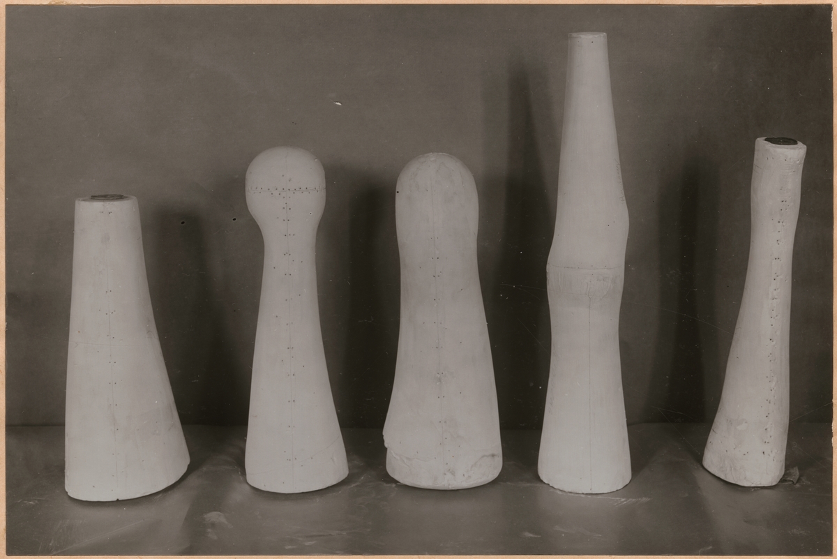 Visar olika slag av positiva gipsavgjutningar av amputationer, första delen i tillverkningsproceduren av proteser.