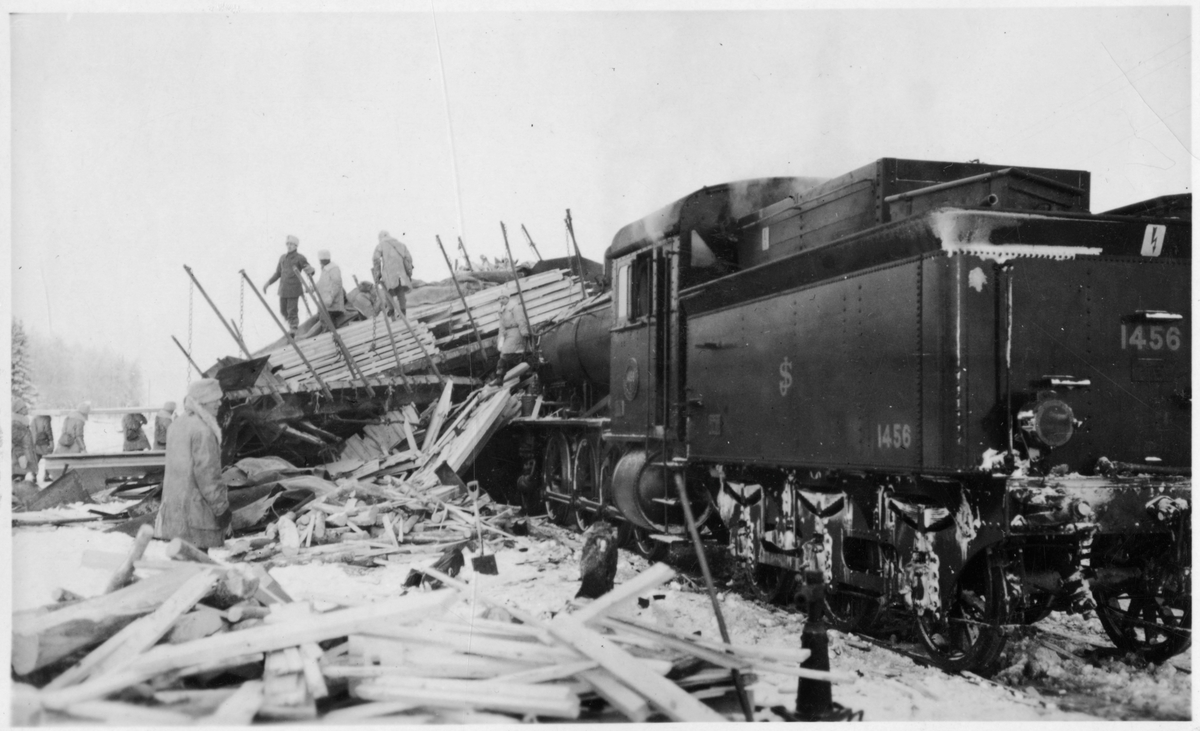 Ånglok samt vagnar och personal vid järnvägsolycka.
