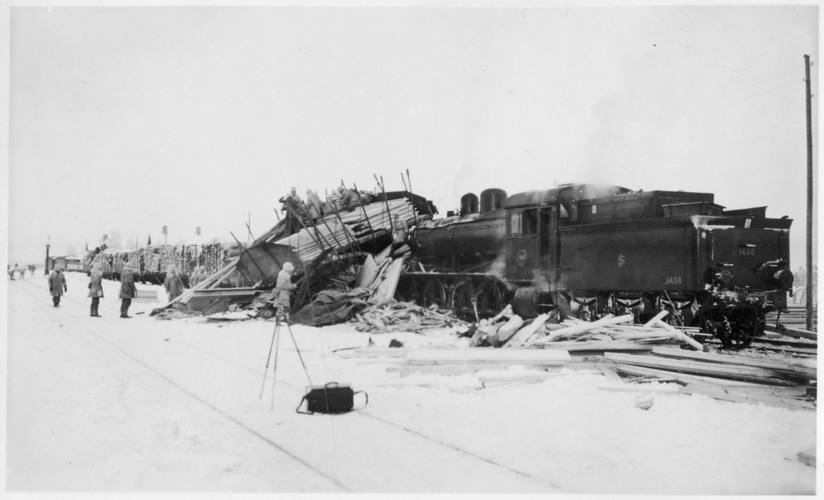 Personal samt godsvagnar och ånglok med tender vid järnvägsolycka.