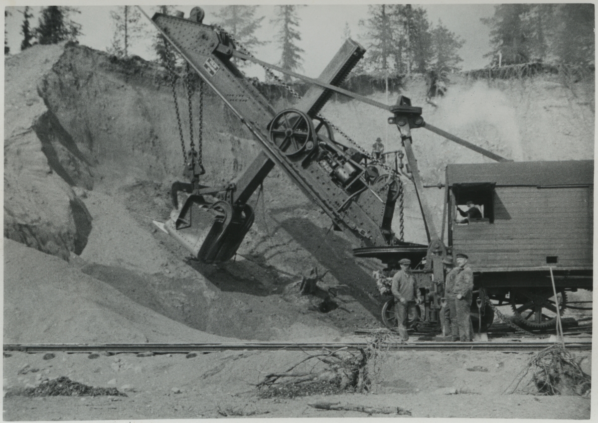 Arbete med en ångdriven grävmaskin, troligen i ett grustag för fyllnadsmassor till bygget av Inlandsbanan.