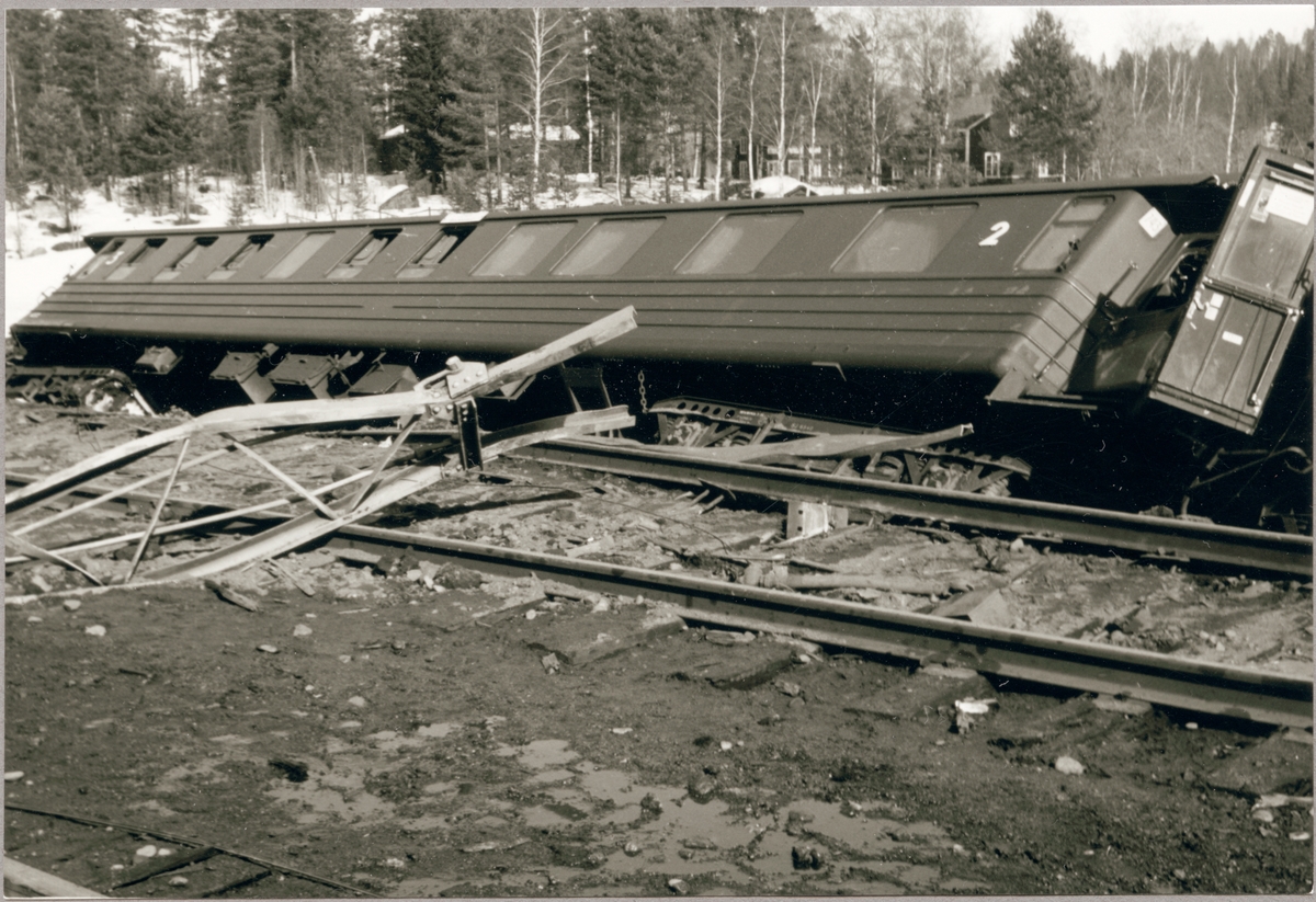 Urspårad vagn och nedriven kontaktledningstolpe efter urspårning.