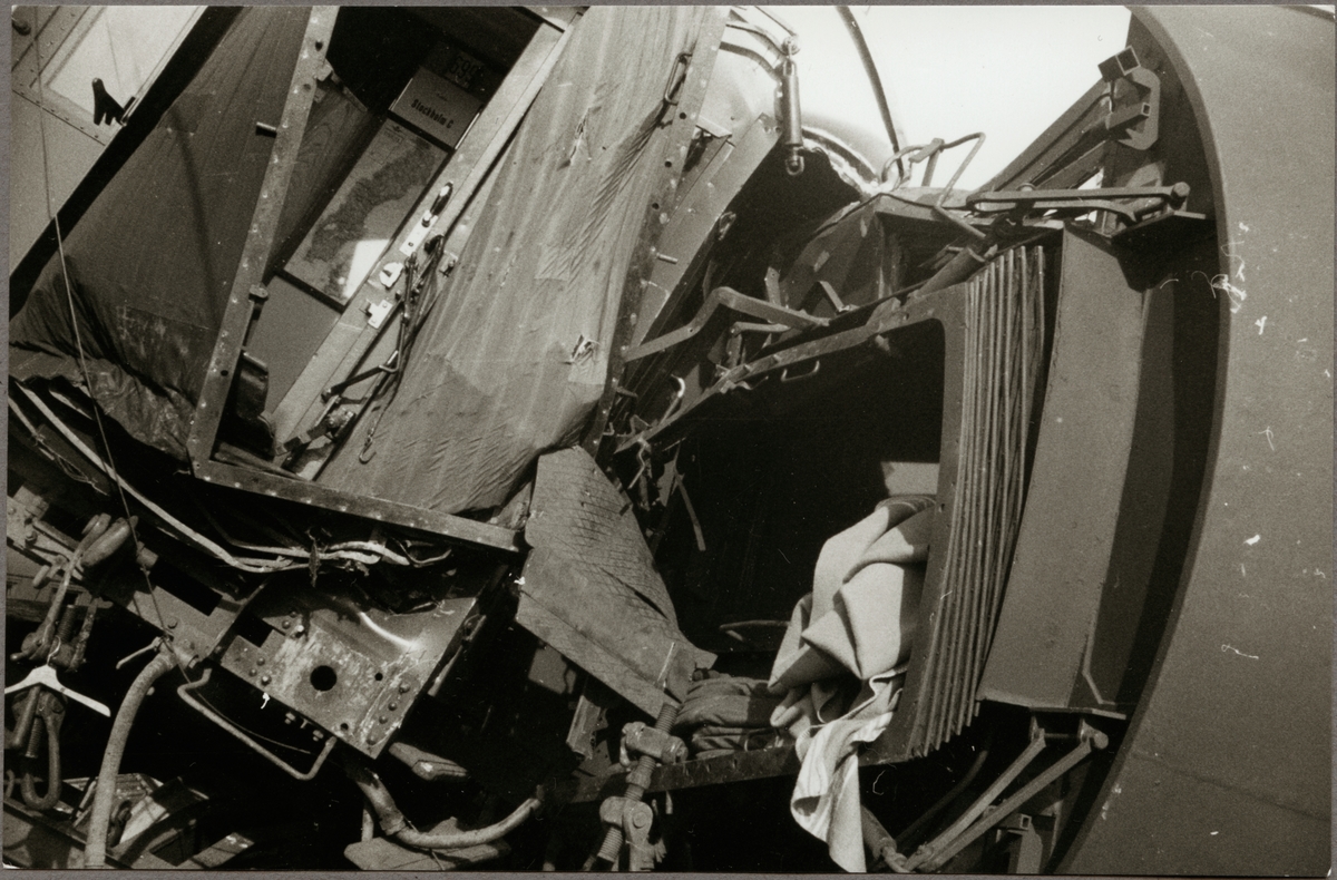 Titel: Närbild på vagnskador efter tågolycka.
