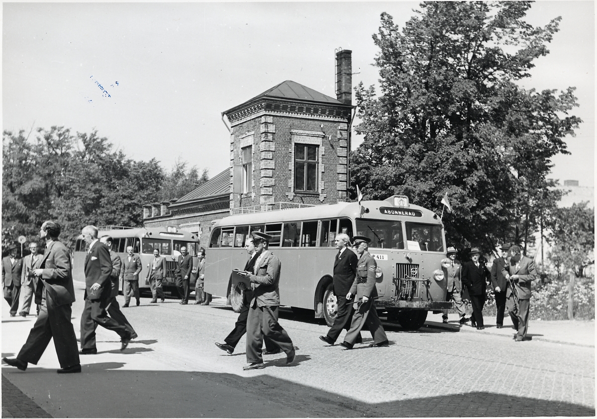 Vänersborgs Televerkstad. Järnvägstjänstemän anländer i Volvobussar tillhörandes GDG, Trafikförvaltningen Göteborg-Dalarne-Gävle.