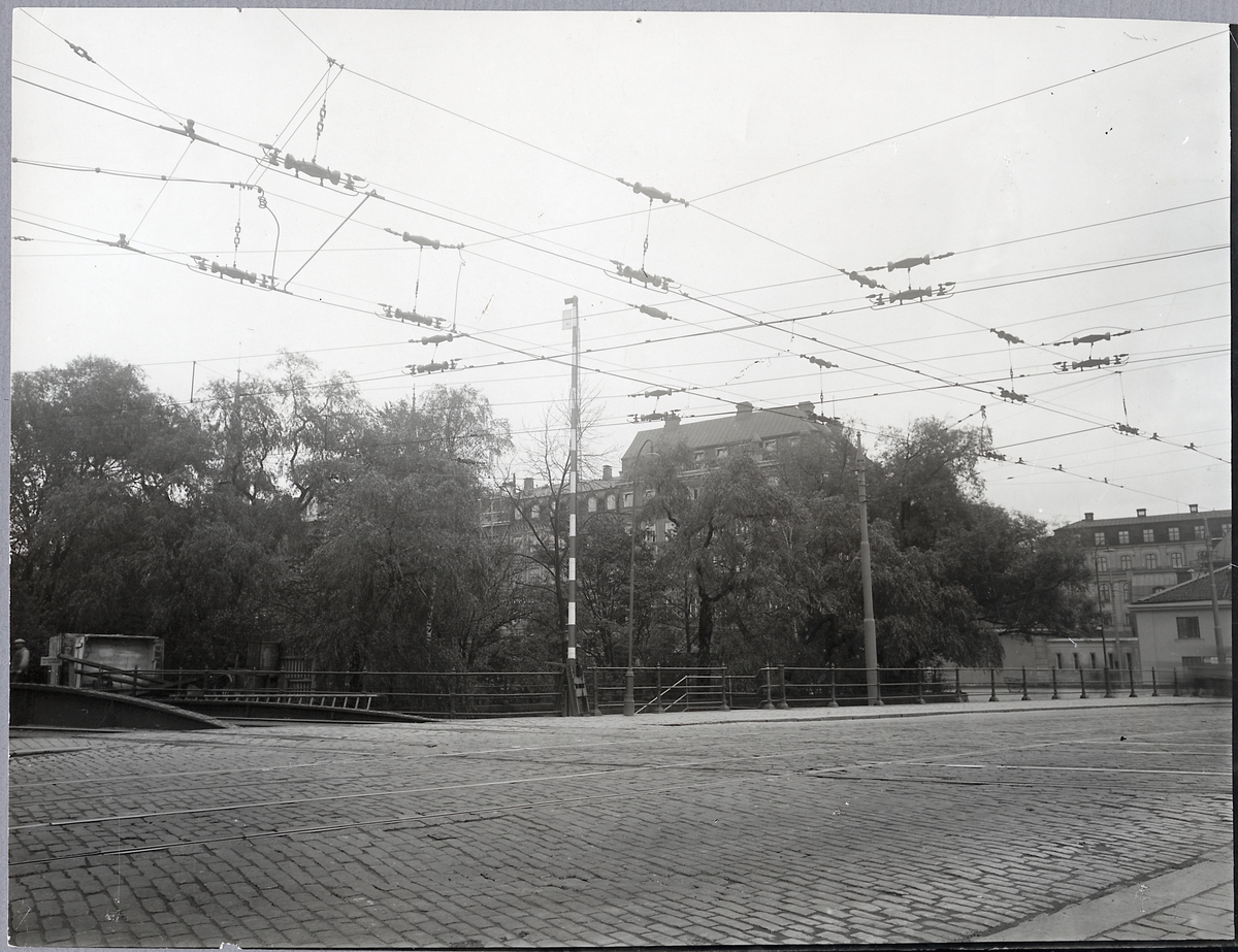 Ledningsupphängning vid Tegelbacken. Korsningen mellan järnväg och spårvagn. Kontaktledningar. På sträckan mellan Stockholm Central och Riddarholmen.