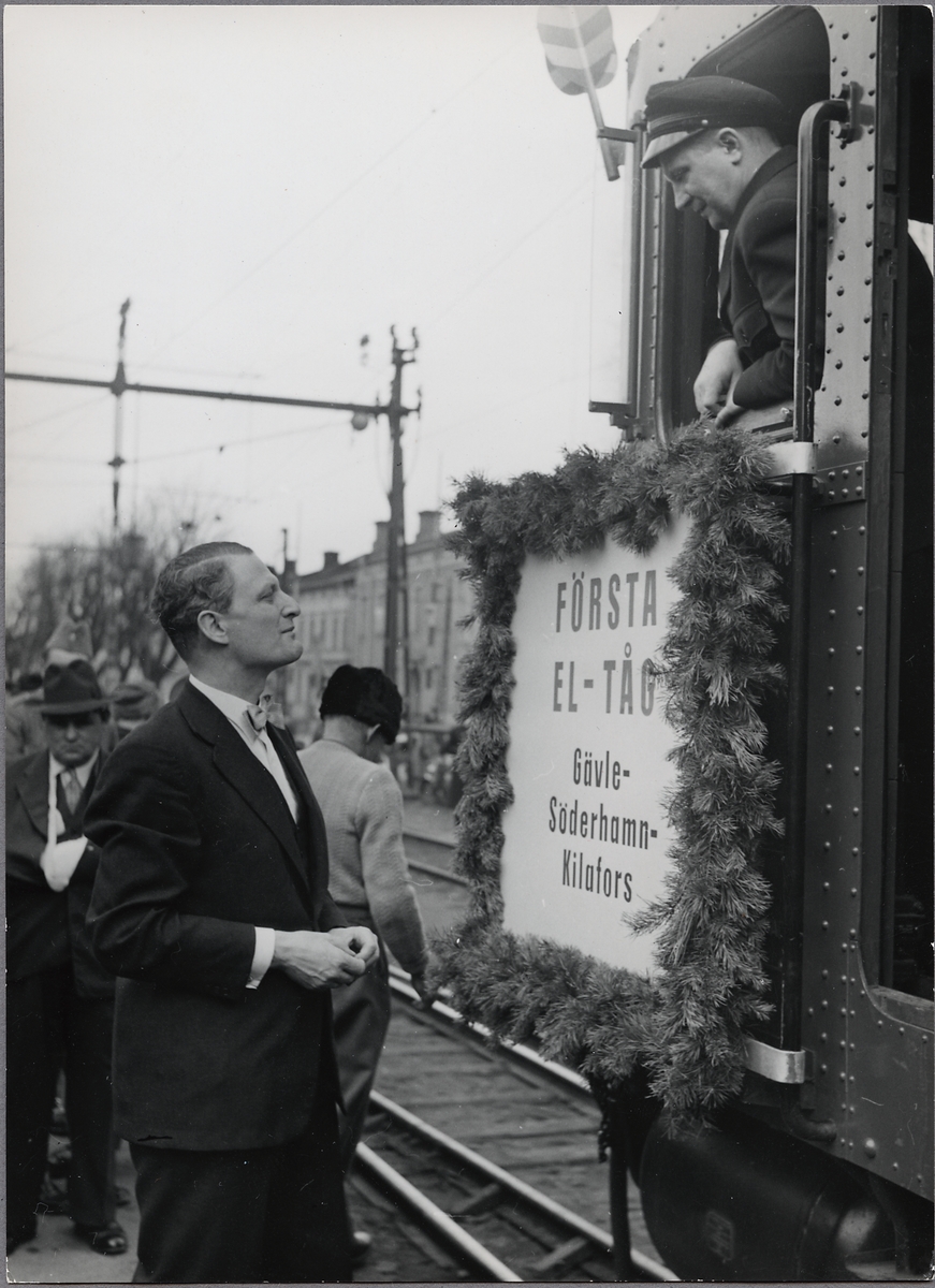 Första eltåget med bl a Generaldirektör Erik Upmark någonstans på linjen Gävle - Söderhamn - Kilafors. Statens Järnvägar, SJ Da 810.