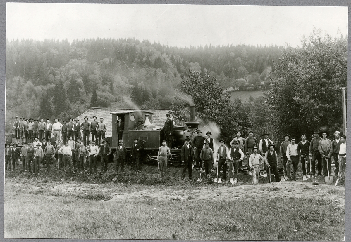 Rallare vid Billingspasset på linjen mellan Våmbskleven och Varnhem. Skövde Axvalls Järnväg, SAJ lok 4 "Varnhem".