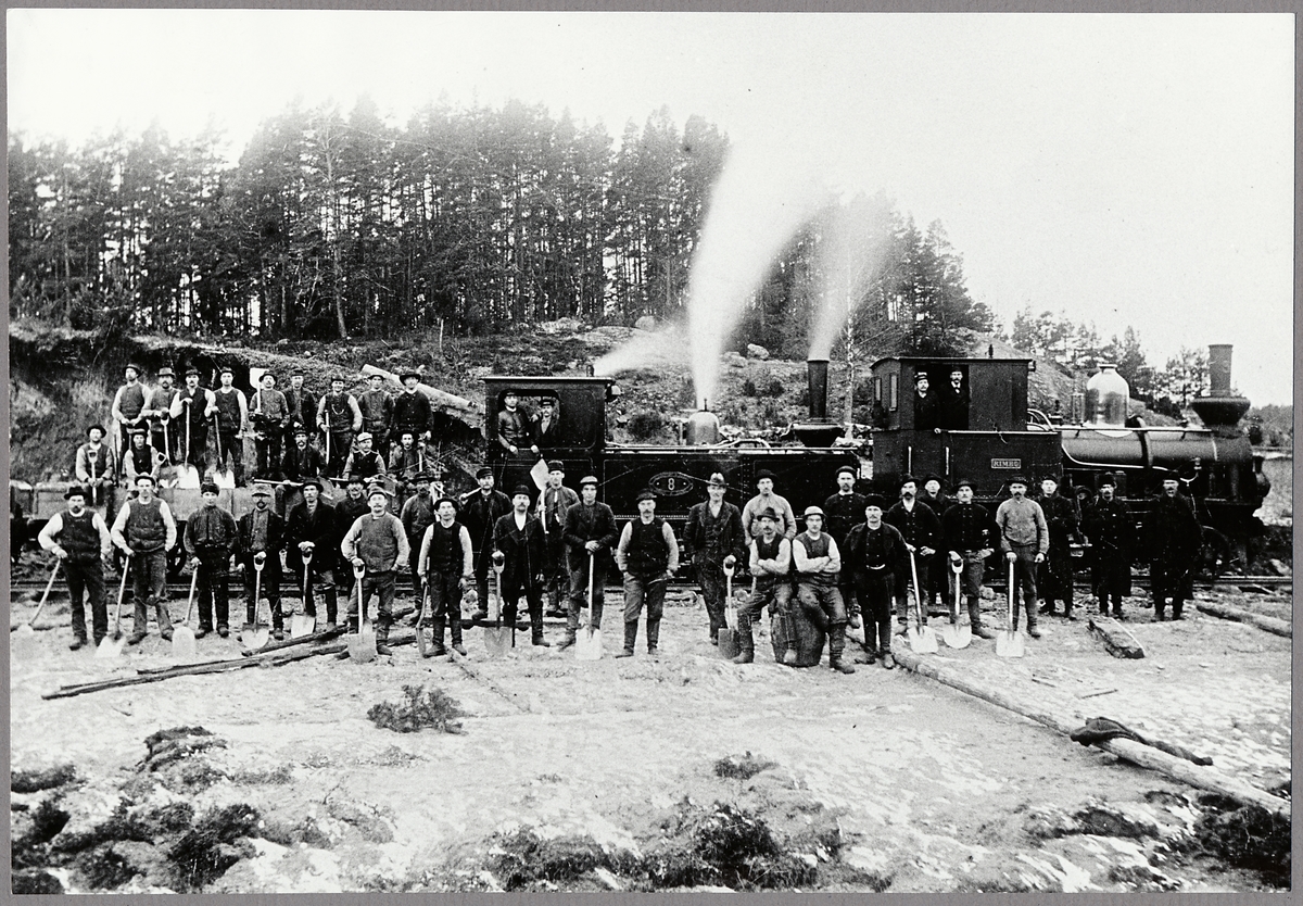 Järnvägsbygge på SRJ. Stockholm - Roslagens Järnväg, Ångloken SRJ lok 3 "Rimbo" och SRJ lok 8.