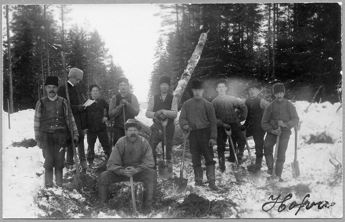 Arbetslag vid byggandet av järnvägen vid Hova på Västergötland - Göteborgs Järnväg (VGJ), sträckan Mariestad - Gårdsjö. Mannen i ljus pälsmössa är ingenjör Hjortberg och till höger om den lutande trädstammen står Ture Andersson som senare kom att bli banmästare vid VGJ.