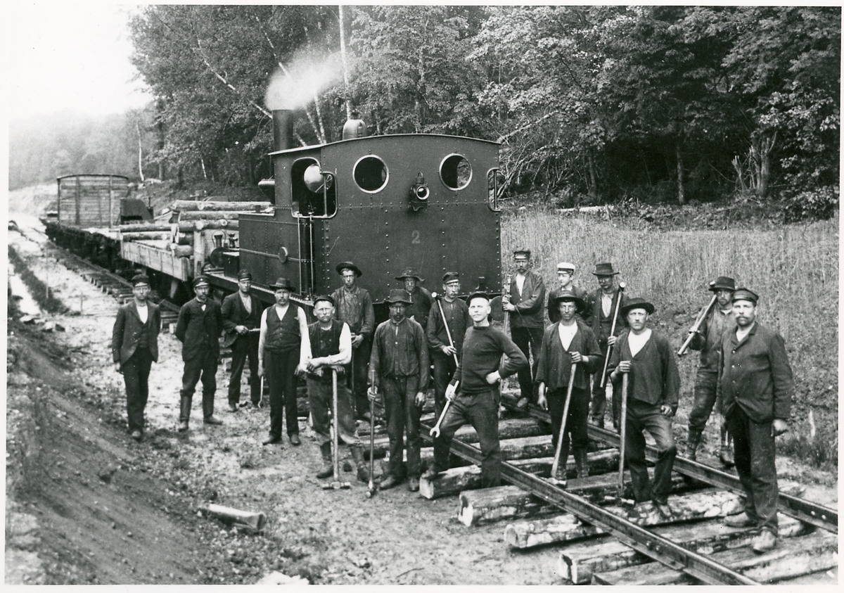 Halmstad - Nässjö Järnväg, HNJ A 2 "Torup". Här med ett rälsläggarlag vid bygget av Västra Centralbanan mellan Landeryd och Falköping Ranten.