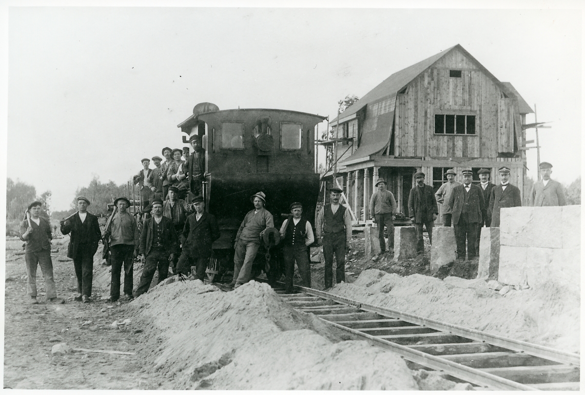 Banarbete på linjen Bergkvara - Gullaboby. I bakgrunden syns ett påbörjat bygge av ett stationshus.