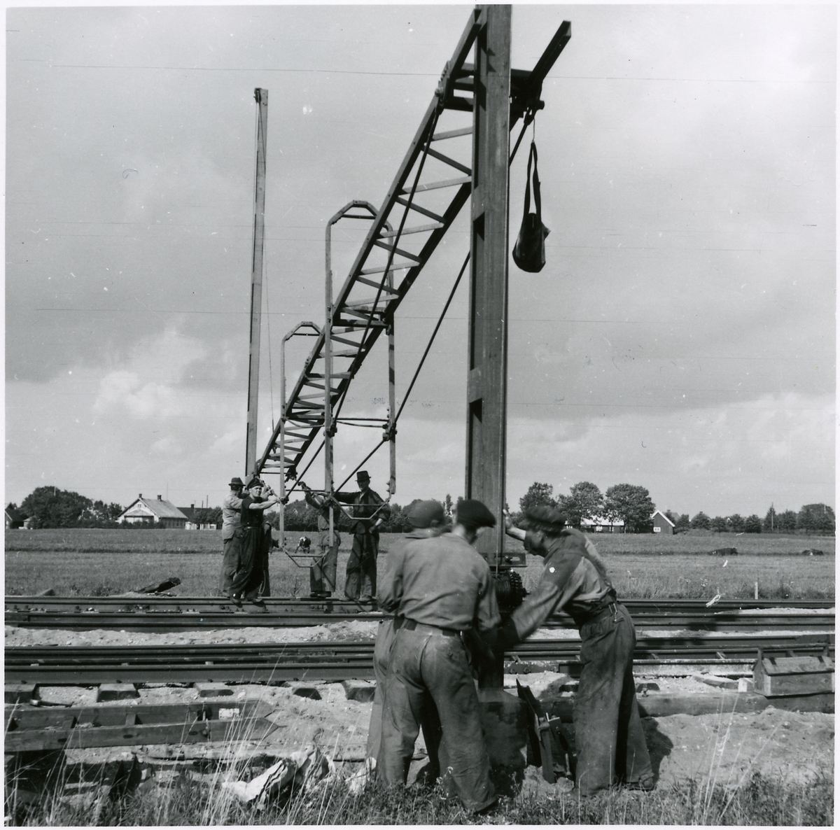 Elektrifieringsarbete på linjen Hälsingborg - Hässleholm. På bilden hissas ledningsbryggan.