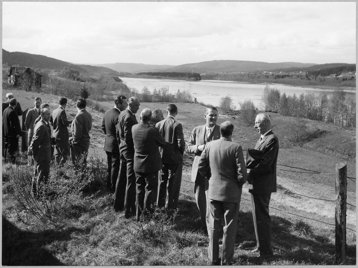Järnvägstjänstemän, däribland dåvarande generaldirektör Erik Upmark, någonstans längs sträckan Härnösand - Långsele, i samband med invigningen av eldriften på sträckan Härnösand - Sollefteå - Långsele.