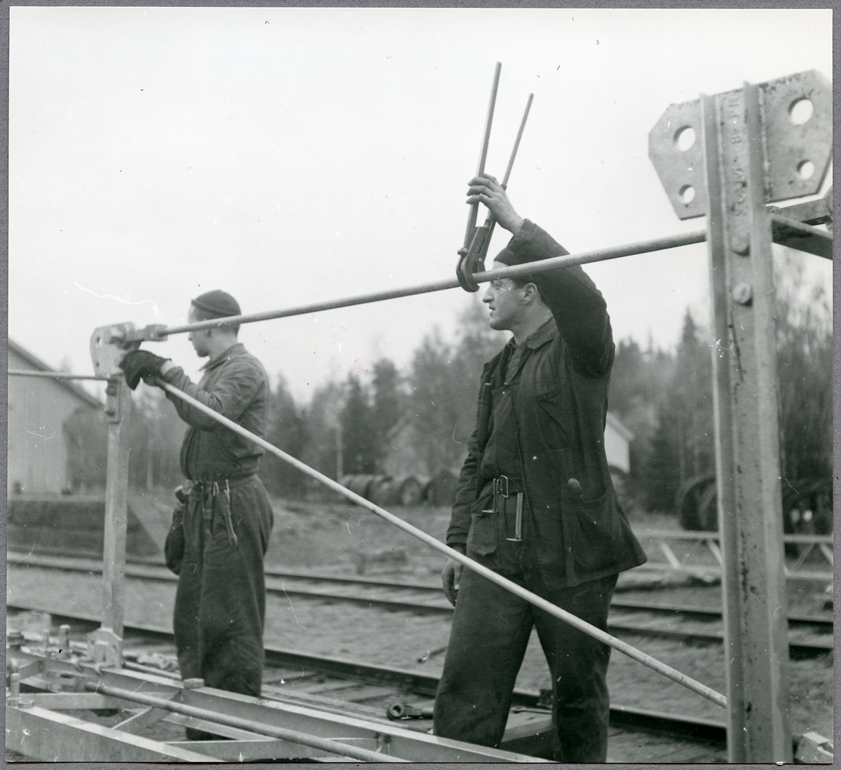Montering av kontaktledningsstolpar någonstans på linjen Gävle - Söderhamn - Kilafors.