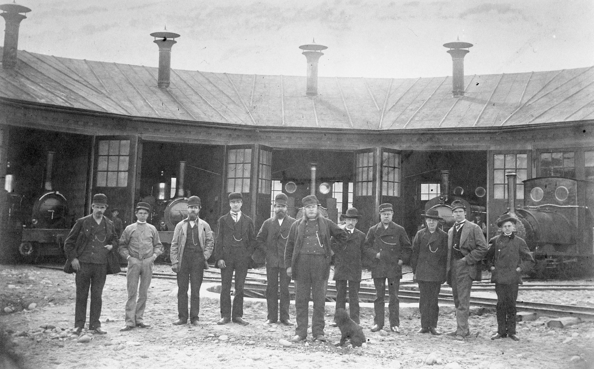 Personal utanför lokstall. Nordmark - Klarälvens Järnväg, NKlJ.