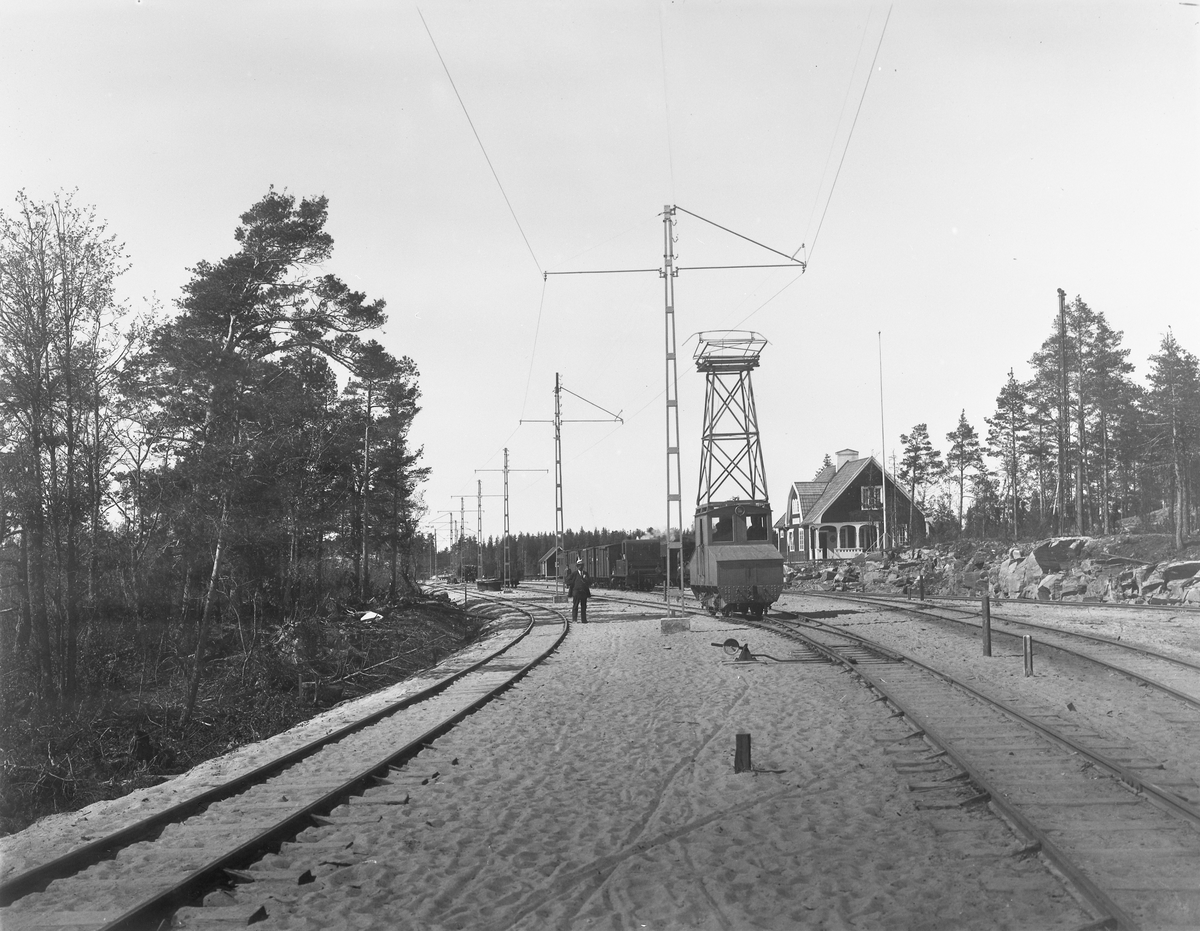 Skoghalls sågverks ellok 7. Nordmark-Klarälvens Järnväg, NKlJ persontåg i bakgrunden.