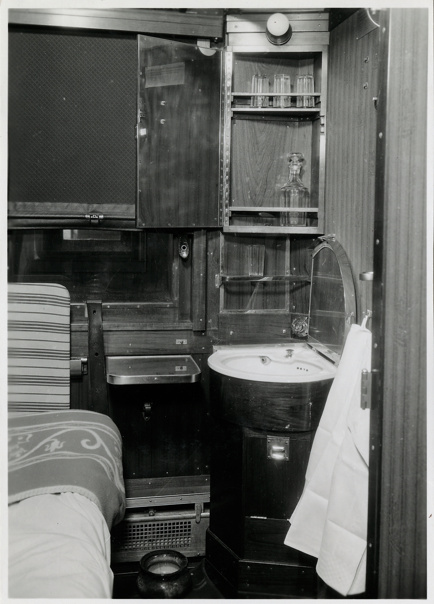 Titel: Tvättställ i 1:a klassens sovkupé i personvagn SJ AC04. Statens Järnvägar.