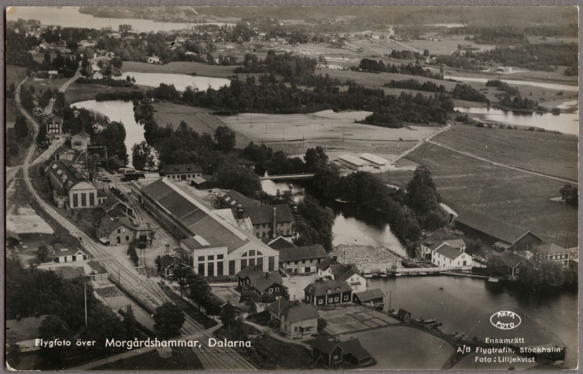 Flygvy över Morgårdshammar, fabriksbyggnaden i bild tillhör Morgårdshammar Verkstads Aktiebolag.